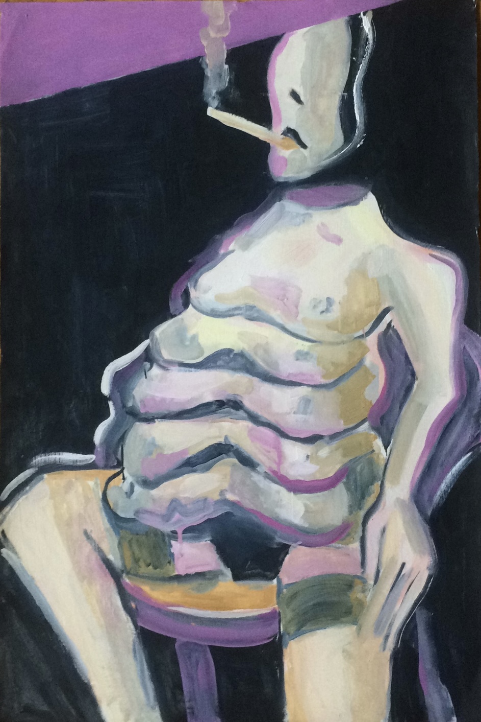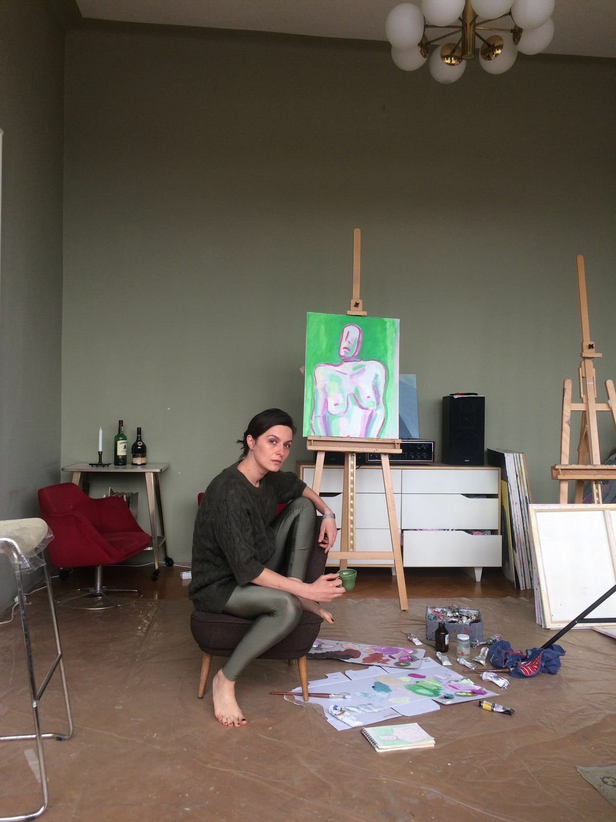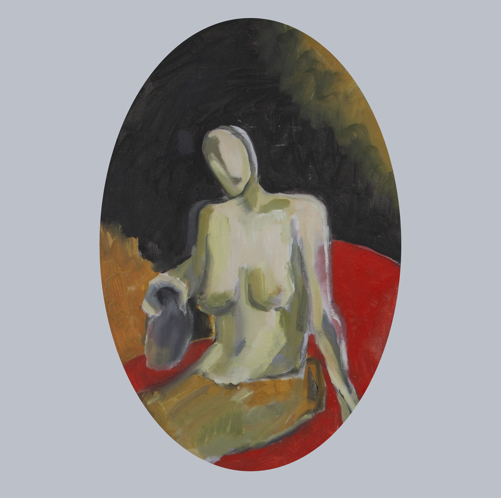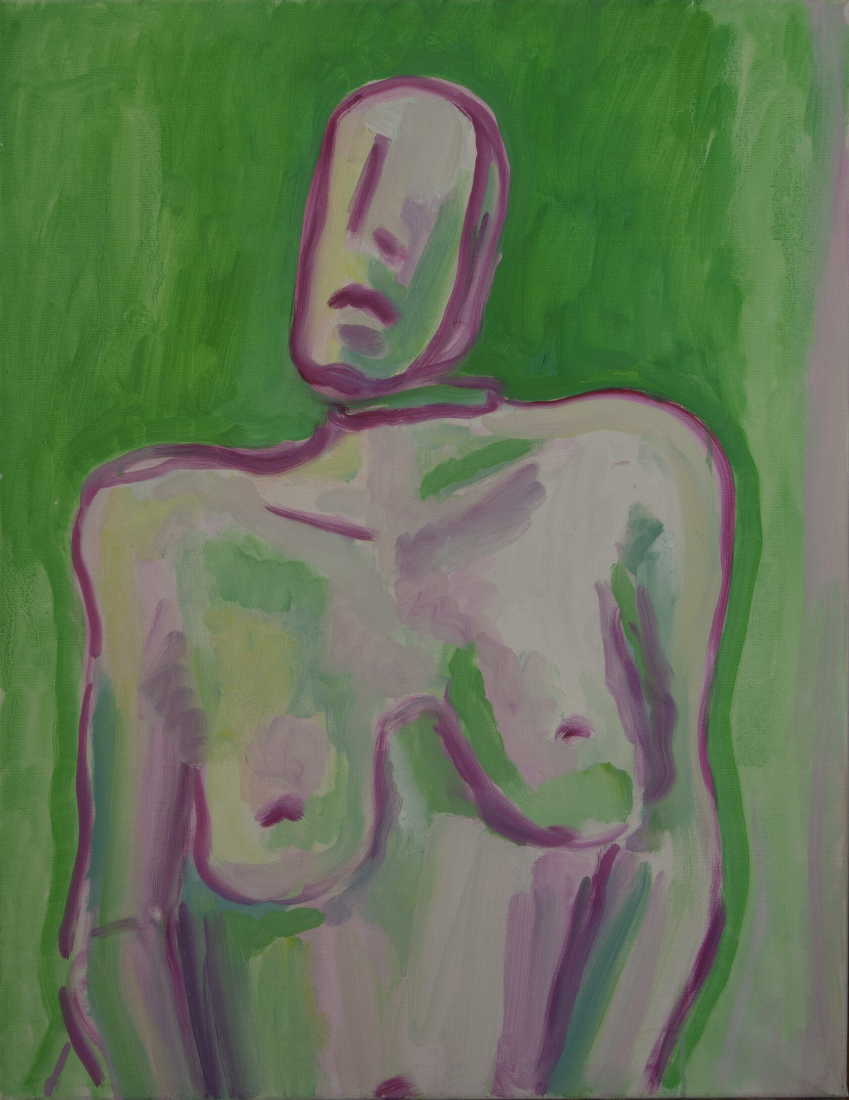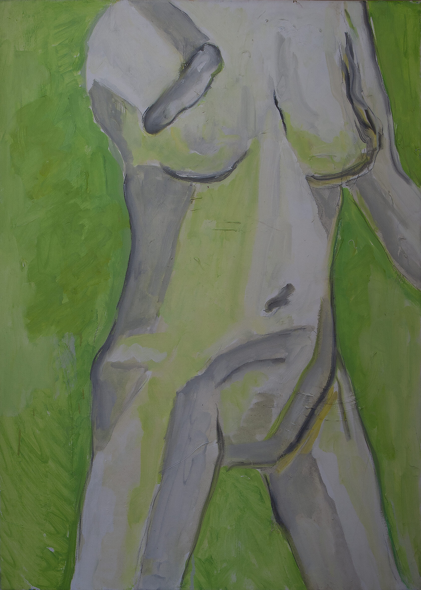 Here the figure is partly imitating an antique sculpture of Venus (which is mostly exhibited with a broken hand), and partly depicting artist's state. There is even a C-section scar seen. The acidic green is chosen to increase the impression of pain. The color is also inspired by minerals Aragonite and Pyromorphite.