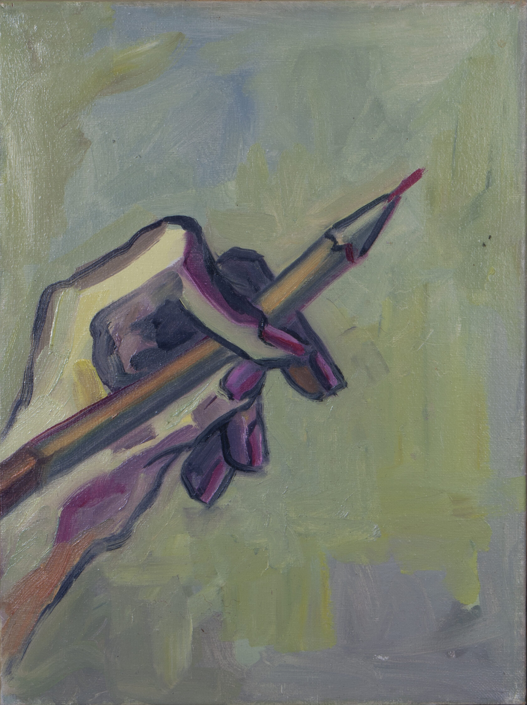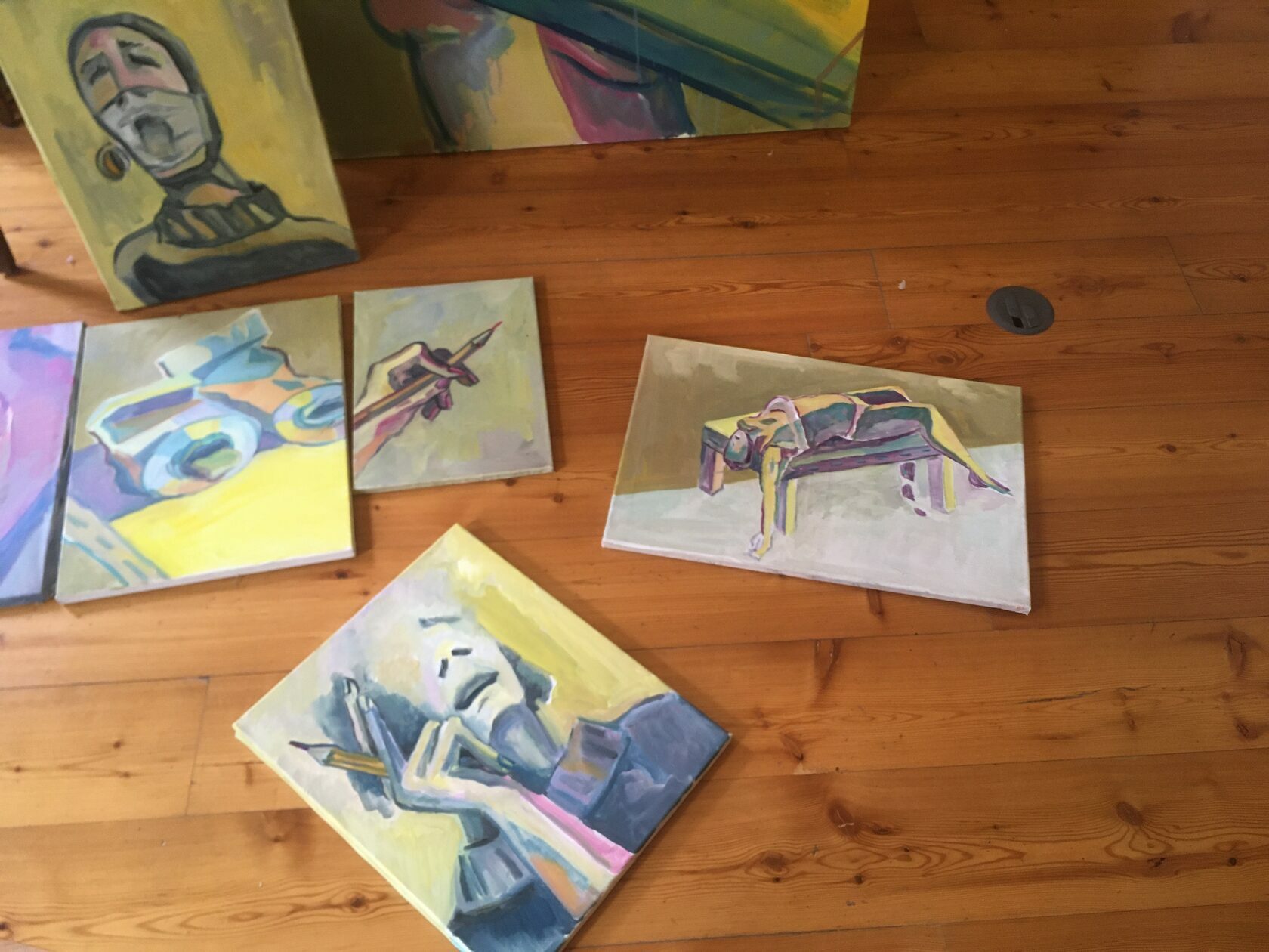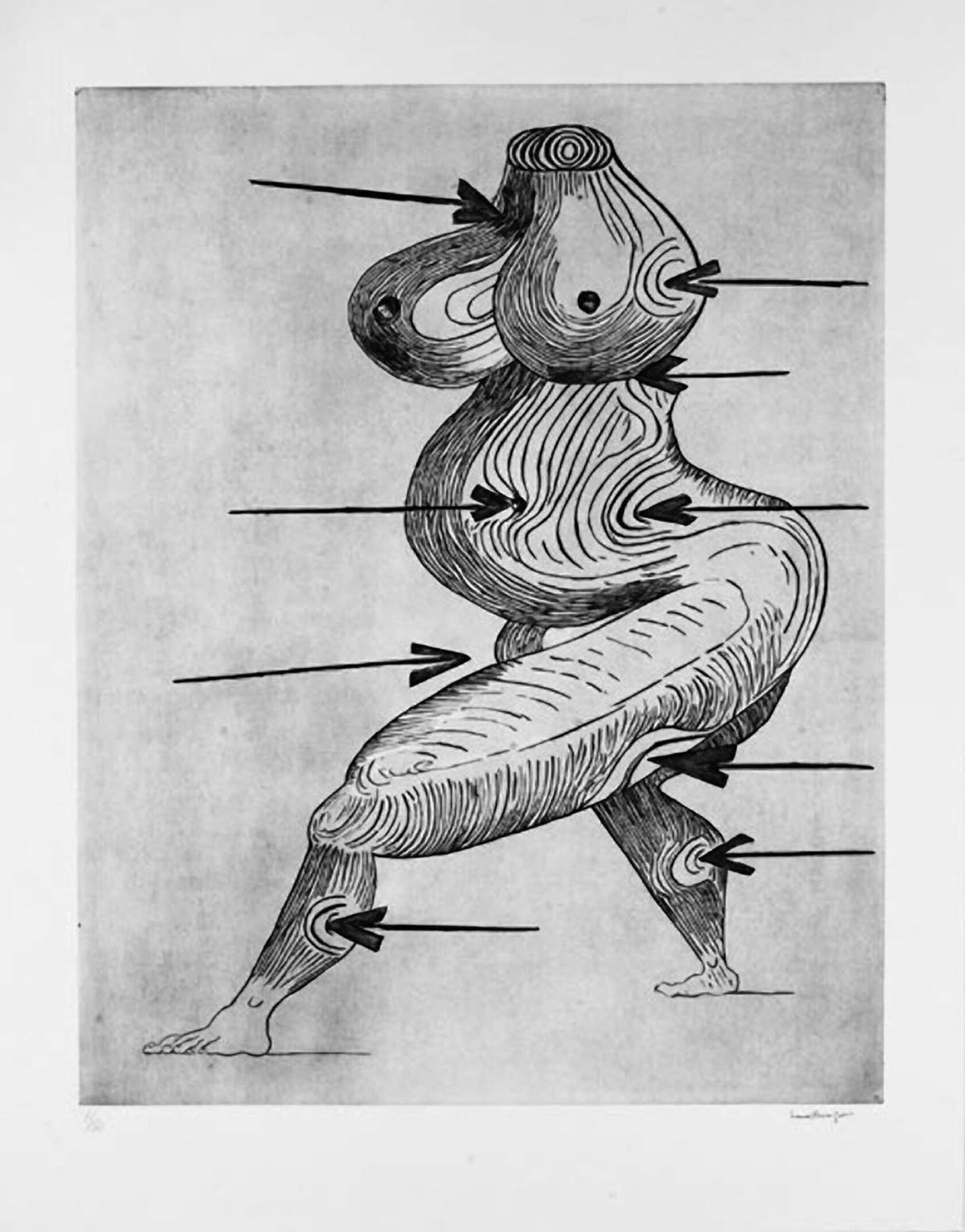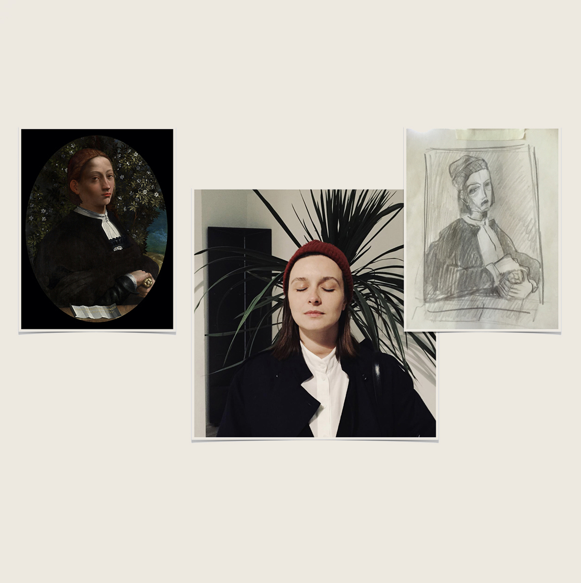 Here the figure is partly imitating an antique sculpture of Venus (which is mostly exhibited with a broken hand), and partly depicting artist's state. There is even a C-section scar seen. The acidic green is chosen to increase the impression of pain. The color is also inspired by minerals Aragonite and Pyromorphite.