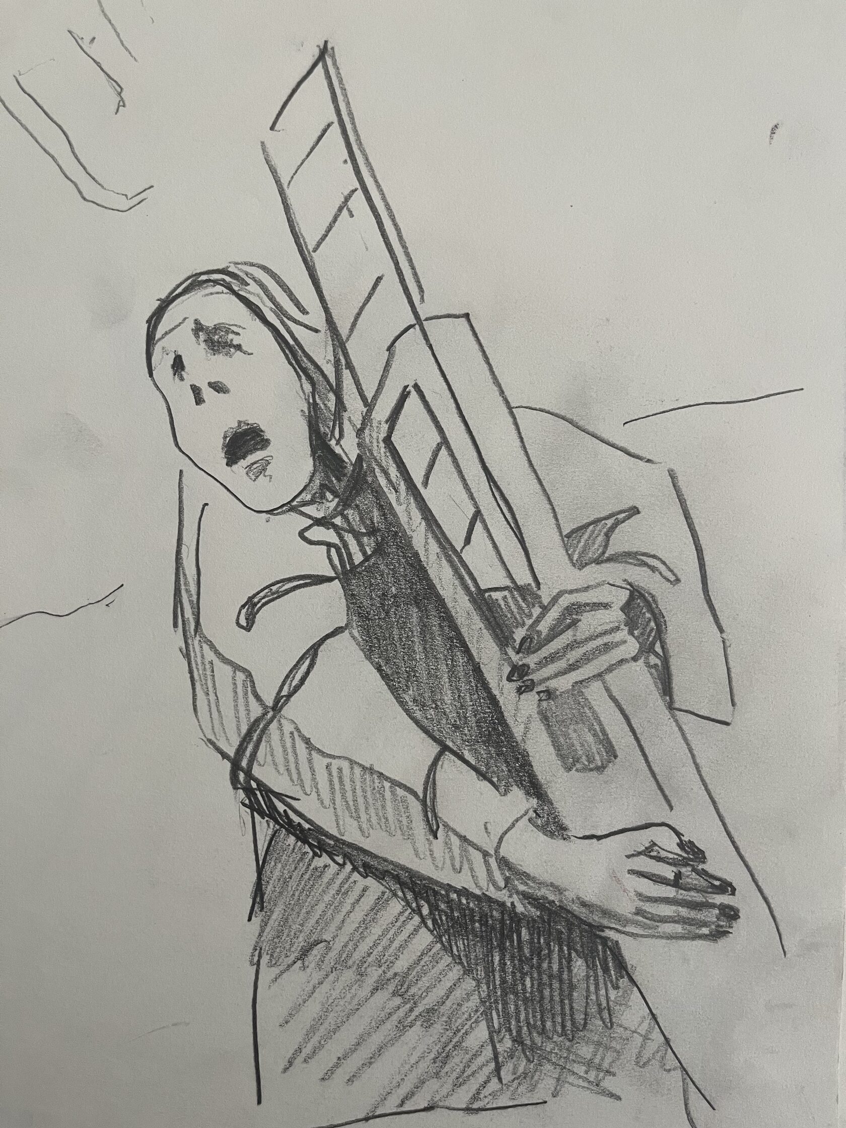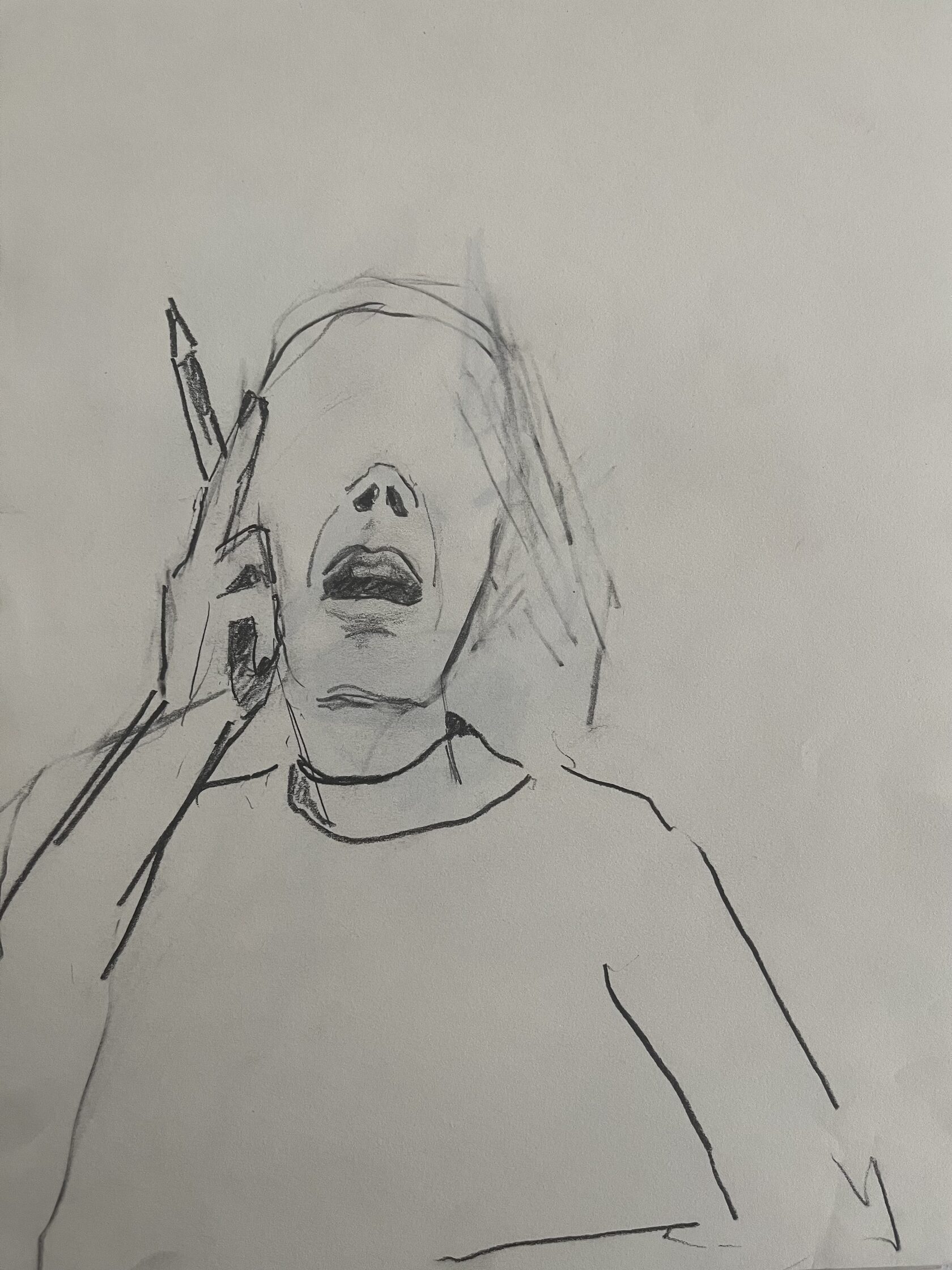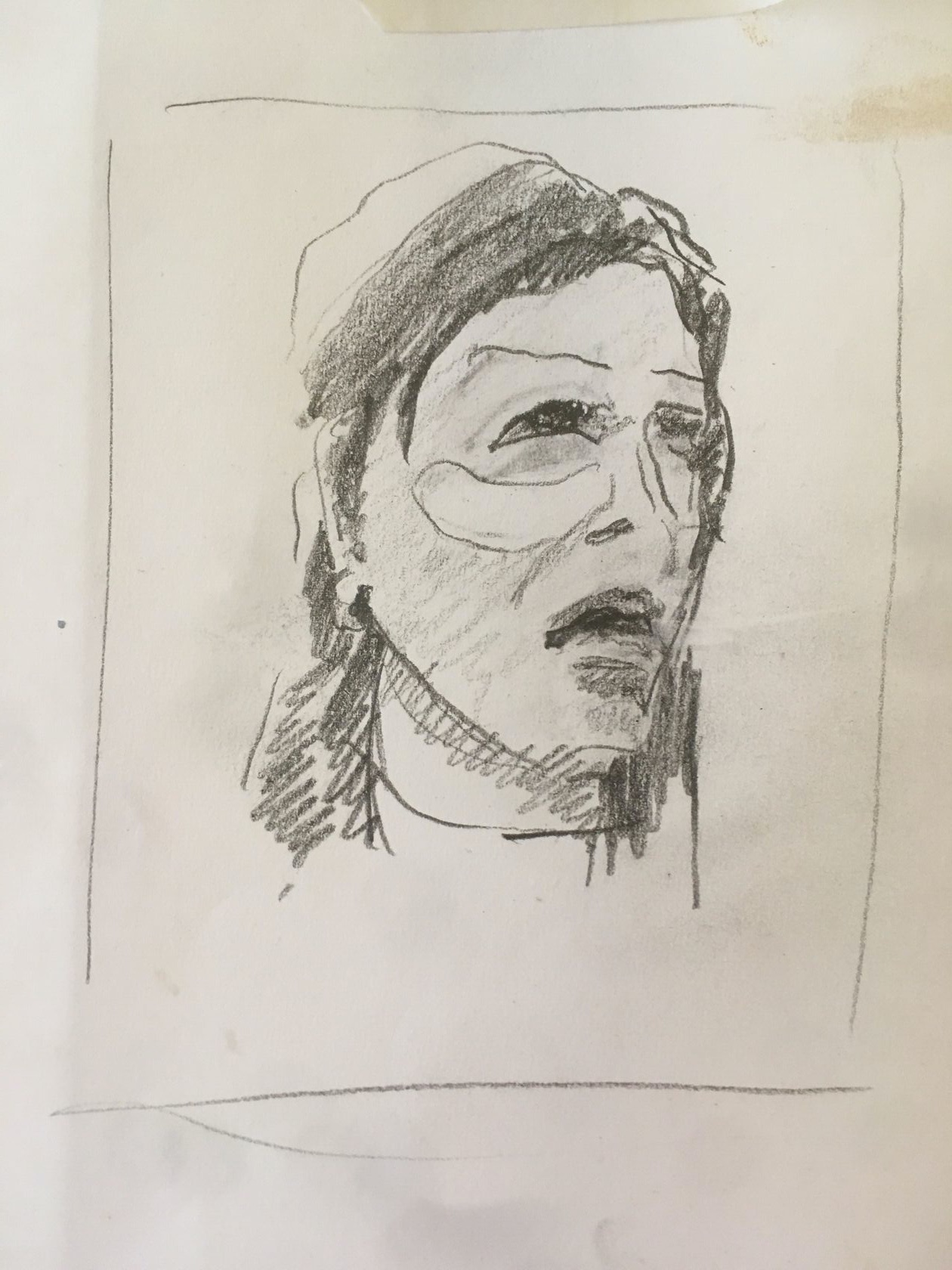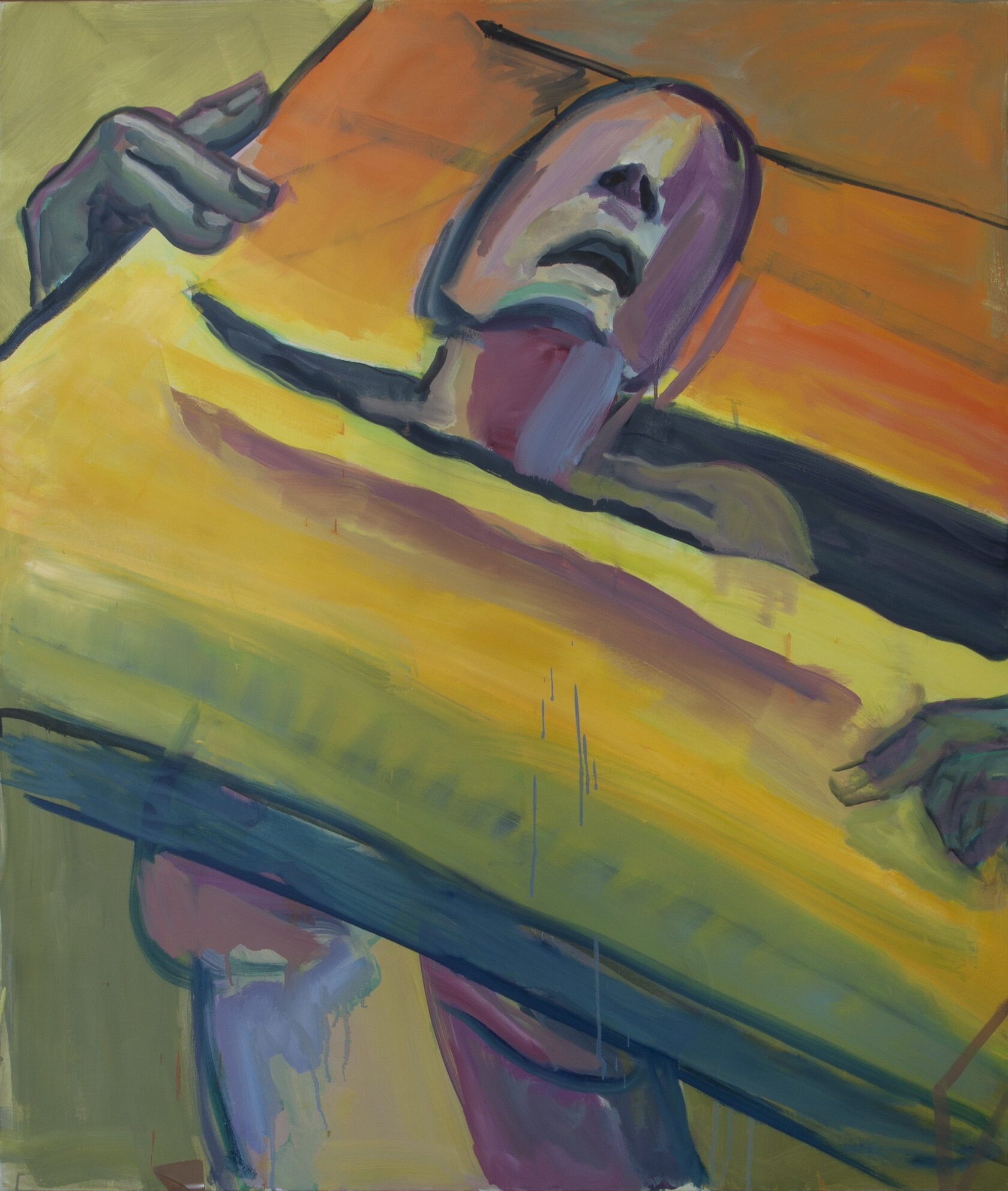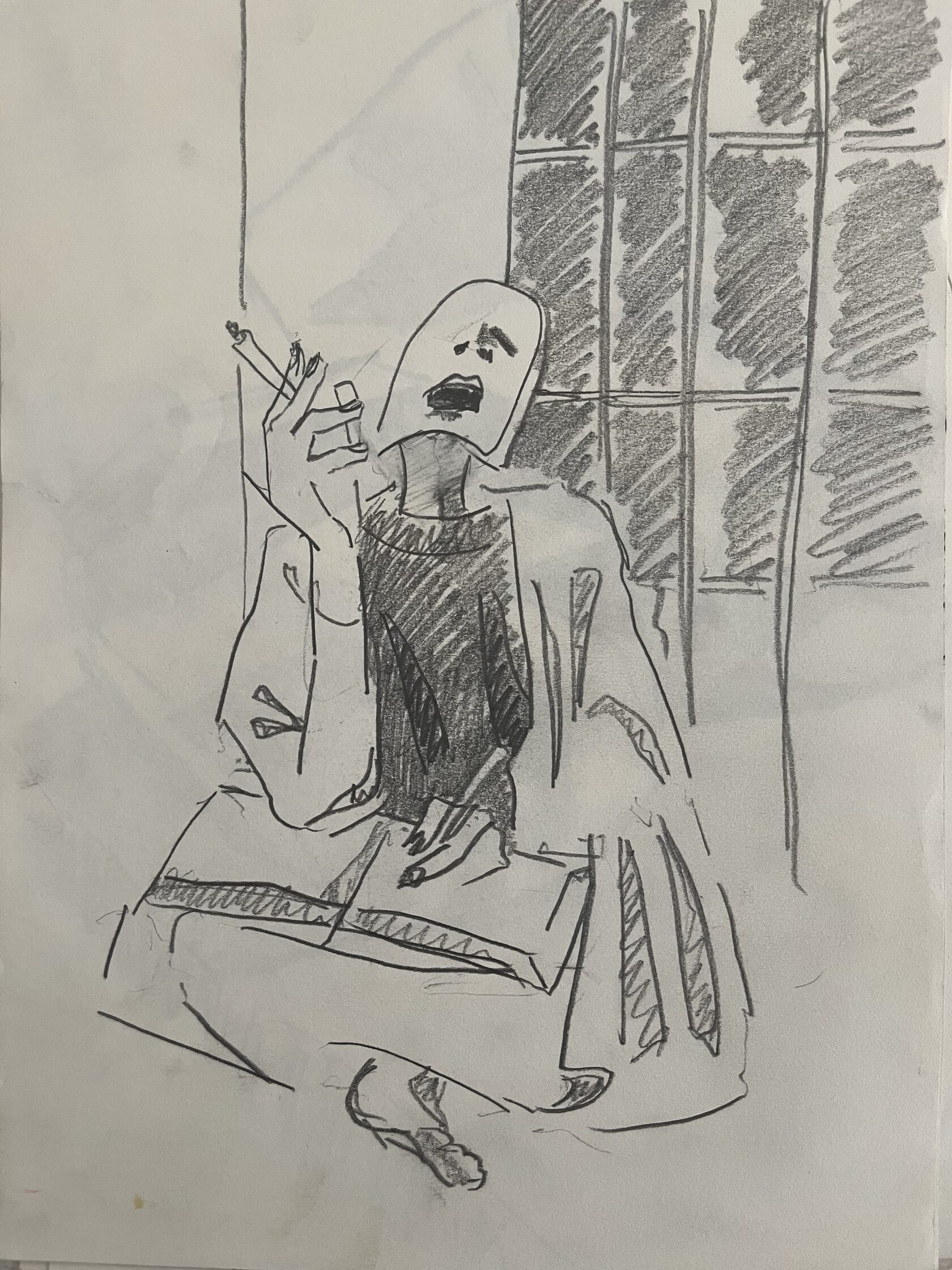 Here the figure is partly imitating an antique sculpture of Venus (which is mostly exhibited with a broken hand), and partly depicting artist's state. There is even a C-section scar seen. The acidic green is chosen to increase the impression of pain. The color is also inspired by minerals Aragonite and Pyromorphite.